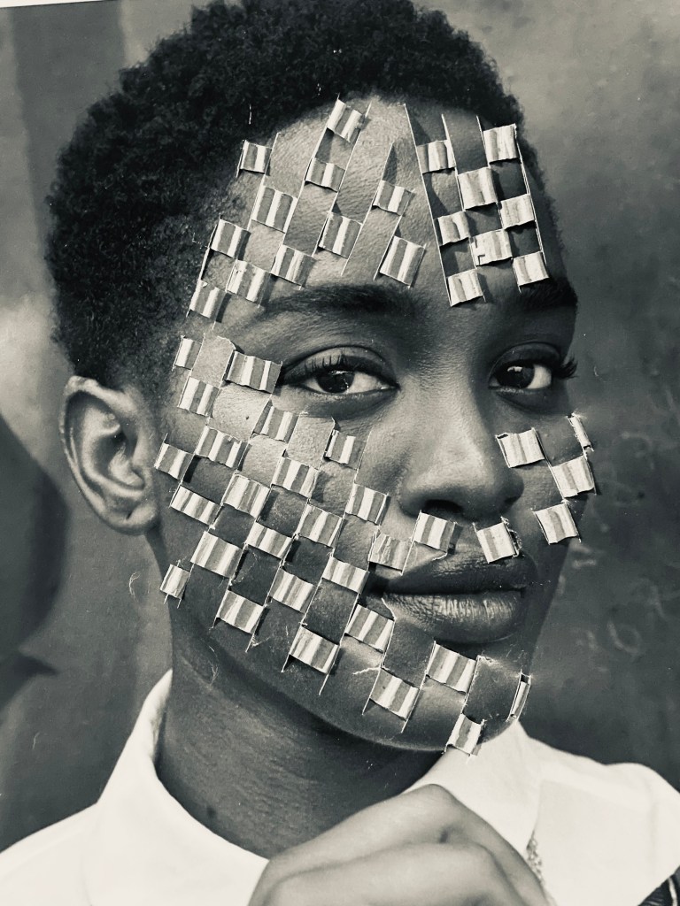During the workshop, I used a single portrait photo to experiment with collage techniques and materials. In the first version, I cut into the face -which may sound a bit unsettling- and wove thick cardboard strips through the openings. This variation in texture and composition changed both the appearance and the tactile quality of the portrait, transforming it into a three-dimensional touchable object.
